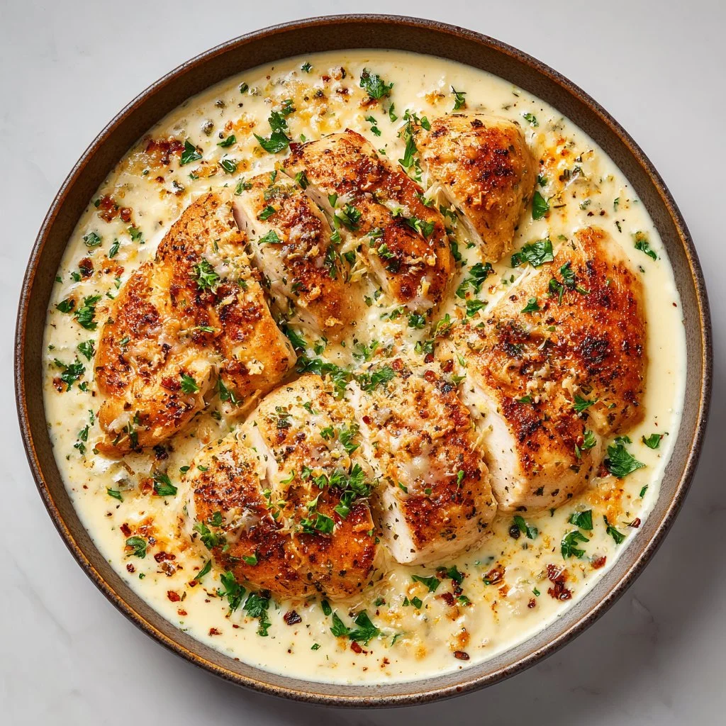 The taste is savory and buttery with a bold garlic punch and nutty Parmesan notes. The texture contrasts a golden-seared exterior on the chicken with a luxuriously creamy sauce that coats each slice, making forkfuls rich but balanced.